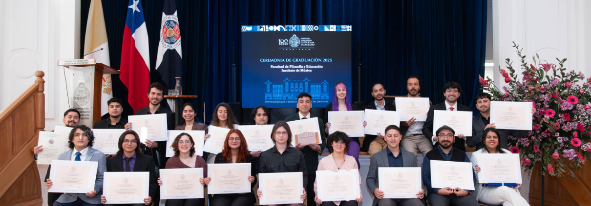 El lunes 29 de septiembre se realizó la Ceremonia de Titulación del Instituto de Música de la PUCV, instancia en la que se graduaron estudiantes de Pedagogía en Música, Licenciatura en Ciencias y Artes Musicales, Licenciatura en Ciencias y Artes Musicales con mención en Composición e Interpretación Musical con mención.