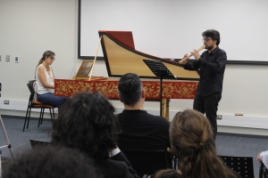 El examen tuvo lugar en la Sala Margot Loyola, donde ambos intérpretes ofrecieron un programa que incluyó obras de Orlando Gibbons, Johann Sebastian Bach, Georg Philipp Telemann y Georg Friedrich Händel, abordando repertorio solista y piezas con acompañamiento.