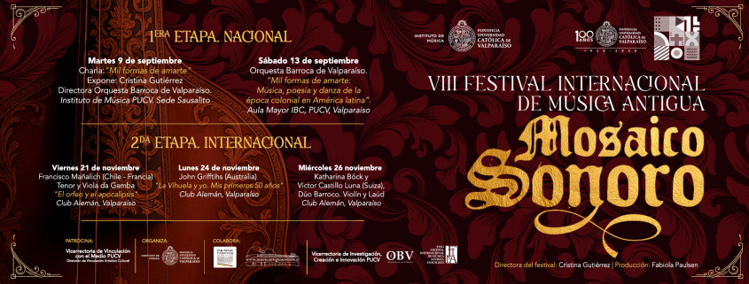 La profesora del Instituto de Música PUCV y directora del Festival, Cristina Gutiérrez, señaló que “el objetivo del festival es la difusión y muestra del trabajo de músicos e investigadores en torno al repertorio del Renacimiento y Barroco. Para esto, contamos con la presencia de importantes músicos y académicos, quienes mostrarán repertorio, instrumentos y prácticas propias de la música antigua a estudiantes y público general”.