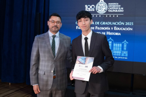 Vicente Jarpa Rojas, egresado de la carrera de Licenciatura en Historia con mención en Ciencia Política de la PUCV, fue reconocido con el Premio a la Mejor Tesis de Licenciatura en Historia 2025, gracias a su investigación desarrollada en torno al Fondo Margot Loyola Palacios, resguardado por el Instituto de Música de la PUCV.